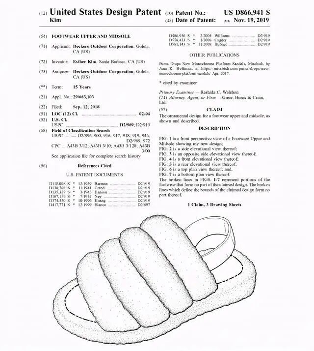 本次外观专利权主要是针对品牌推出的一款毛毛鞋。要知道,外观专利权对于产品的形状、图案都是具有专利保护的,卖家需赶紧自查!下架相关产品!