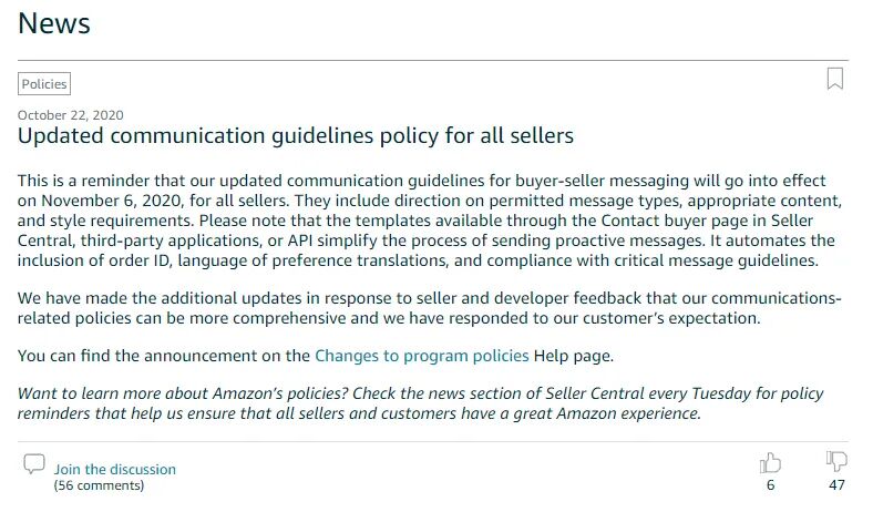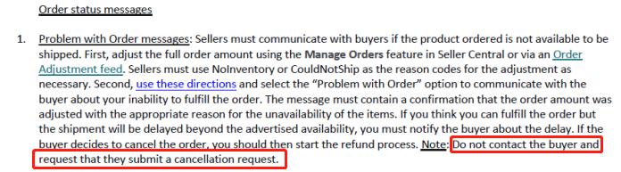 亚马逊后台发邮件通知卖家,新版的交流指南政策将于11月6日正式实施。新政策中针对卖家和买家的联系规则进行明显改动。同时对允许发送的消息类型和内容进行了更新,重点都酷仔都列出来了,笔记安排上!在新版交流指南中明确提出:不允许卖家联系买家以商品缺货等理由要求买家发起取消订单申请!此次最大的改动,也是卖家最容易踩到的点!在此之前,卖家因为缺货等原因发邮件请求买家取消订单是常规操作。这关系到两个店铺绩效,一个是“发货前取消率”,是指由发货前由卖家取消订单;另一个是“迟发率”,指产品无法在规定期间内发货。当这两个订单缺陷率超过目标数值时,卖家店铺会有被冻结的风险。因此,为了避免发货前取消或无法在规定时间内发货被记入店铺绩效,写信要求买家取消订单是最理想的方法。但是11月6日之后,卖家不能再这样操作了,会违反交流指南,严重的将被移除销售权。解决方法在新版指南中有提出,当卖家因为缺货或是其他原因无法为订单配送产品时,应按以下操作:1. 选择 “No Inventory”或“CouldNotShip”作为原因来调整订单;