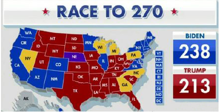截止北京时间周三(11月4日)13:40,2020美国大选实时票数统计:拜登238VS特朗普213。