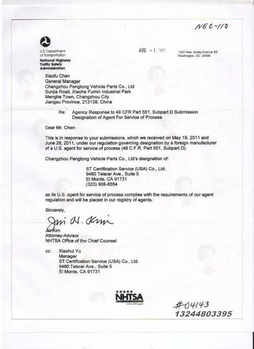 2、向DOT递交代理人指定文件,代理人认可文件,联邦机动车辆安全标准(FMVSS)符合性申请书。