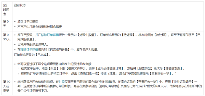 卖家可使用亚马逊物流清仓,通过提供商清算库存,不再为弃置、除冗余库存、买家退回的亚马逊物流库存而付款。通过清算库存,卖家可收回部分库存费用,能避免支付月度和长期仓储费。即:通过清算库存来接收付款(“净回收价值”),而不是向亚马逊付款来弃置库存。
