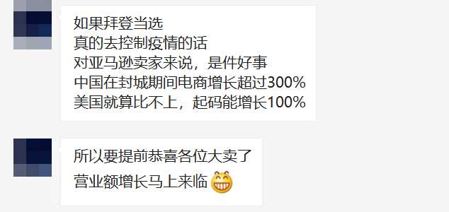 还有卖家通过预测大选结果,开始给自己打鸡血:如果拜登当选,真的去控制疫情的话,对亚马逊卖家来说,是件好事。中国在封城期间电商增长超过300%,美国就算比不上,起码能增长100%。所以要提前恭喜各位大卖,营业额增长马上来临!