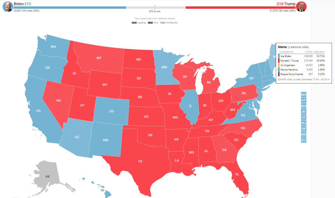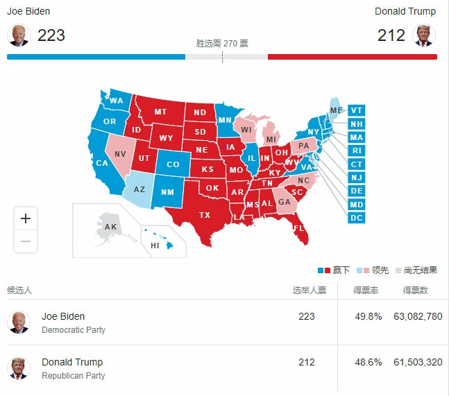 ▲截止14:30拜登和特朗普的选举人票分别为:223:212