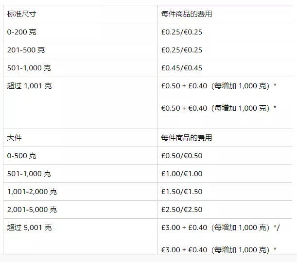 1、每件商品费用(基于尺寸和重量)(英国/欧盟:见下表)