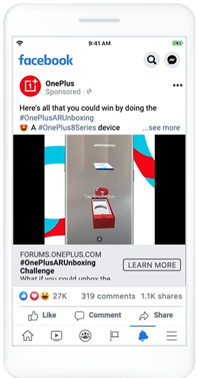 在印度推出OnePlus 8系列时,该科技品牌希望消费者能够在安全舒适的家中直观了解新手机。于是,团队利用增强现实 (AR) 技术,开发了一款Instagram滤镜,打造了业内首开先河的虚拟开箱体验。他们打造出这款AR滤镜后,便率先将其发布到一加的Instagram主页上。消费者可以下载这款滤镜,并在自己的Instagram快拍中使用。启动滤镜后,屏幕上一个红色的长方体盒子掉落下来,随后盒子打开,一台一加手机的虚拟模型便呈现在人们眼前。滤镜模拟真实上手操作的体验,让消费者可以旋转3D模型来随意调整观看视角,轻轻一滑即可切换不同颜色。团队将营销活动的目标受众限定在一加的现有客户以及 18-35 岁的智能手机爱好者。初步试水反响热烈,成效可谓立竿见影。消费者们都乐此不疲地使用着这款滤镜,探索新手机的各种功能,就像他们正在实体店内体验手机一样。为了高效扩大营销规模,让公司作为创新品牌的形象广泛地深入人心,一加在Facebook和Instagram投放了视频广告 (Video Ads) 来推广AR滤镜。同时,公司还举行了在线竞赛,吸引受众接受挑战,以富有创意的方式与滤镜互动。在竞赛的助力下,越来越多的受众参与进来。短短两周内,公司就收到了 1,000 多份参赛作品。