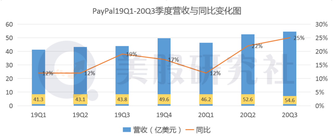 本季度的财报数据显示,PayPal第三季度总营收为54.6亿美元,与上年同期的43.8亿美元相比,同比涨幅达25%;与上一季度的52.6亿美元,环比上涨3.8%。