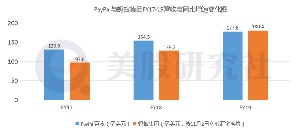 美股研究社通过对比蚂蚁集团与PayPal前几年的营收来看,很显然在17跟18年,PayPal营收规模高于蚂蚁集团,但2019年蚂蚁集团在营收上已经实现赶超。