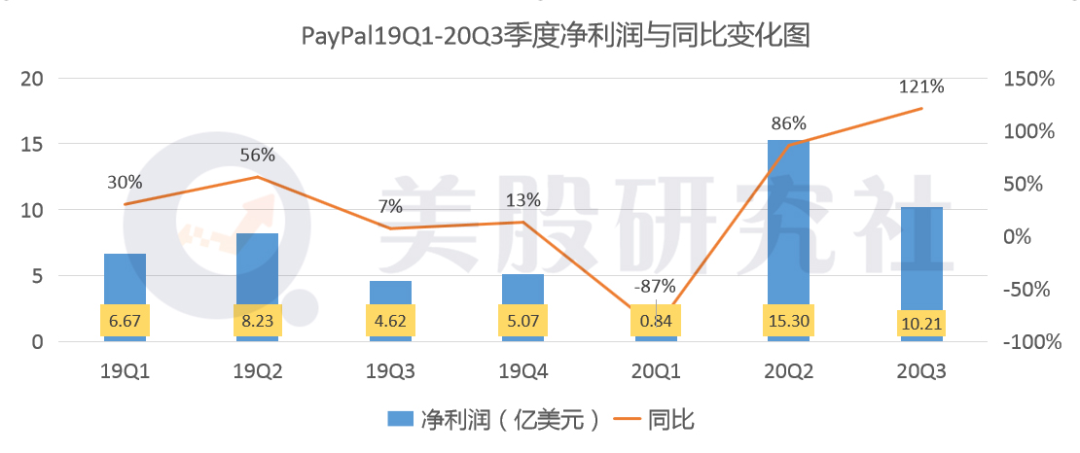 而这种影响也具体体现在PayPal的净利润表现上。本季度,PayPal的净利润为10.21亿美元,同比上涨121%,环比下滑33%。