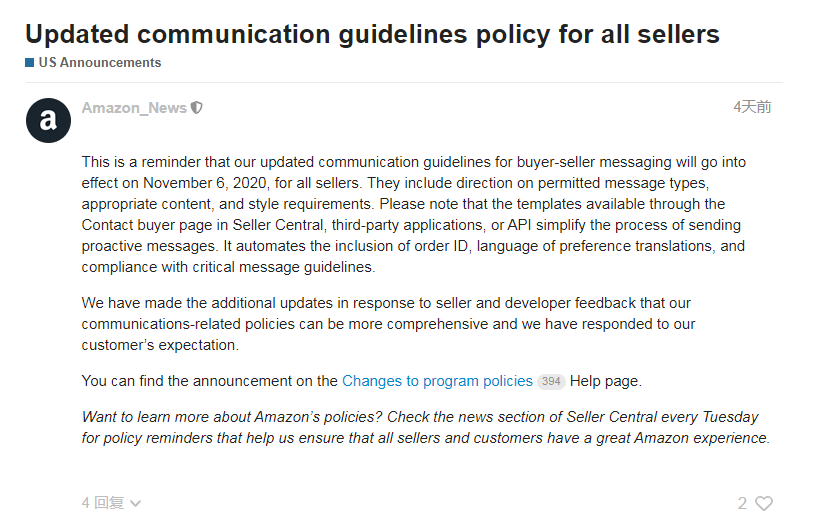 新版的交流指南政策即将于11月6日正式实施,前几天亚马逊也在卖家后台通知了卖家。但是亚马逊修改了一部分关于卖家和买家之间联系时的规则,并且亚马逊还更新了允许发送的消息类型和样式。卖家必须尽快了解。