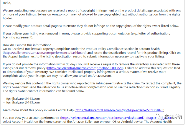 【2】对于这种凭空捏造的侵权,一般情况下,我们联系了对方基本不会得到任何回应,我们可以自行筛选,把有可能侵权的图片、文字都进行整改删除,然后准备给亚马逊的申诉信
