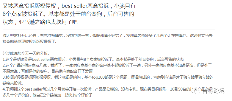 据悉,货源来自于同一个供应商的卖家大部分都收到了投诉,对于销量较少的卖家来说,直接删除listing,“多一事不如少一事”,但是对于TOP卖家来说,确实是不小的冲击。