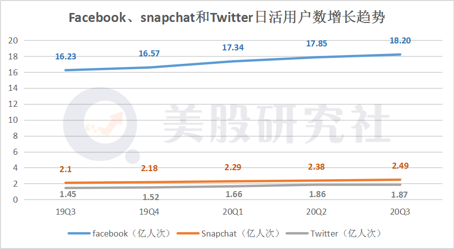 决定广告收入最关键的指标则是日平均可变现活跃用户(mDAU),日平均可变现活跃用户越多则代表该平台的流量越大,越为广告商们所青睐。在本季度,全球社交三巨头Facebook、Twitter、Snap都在日活用户上实现一定增长