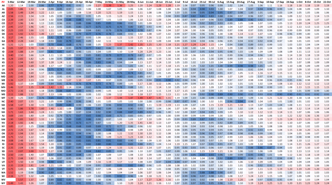 相比之下,目前美国第三波疫情相对严重的中西部各州依然都处于完全的复工状态、尚未采取太多措施,且R0普遍高于1,因此预计当前疫情的升级仍将延续一段时间。