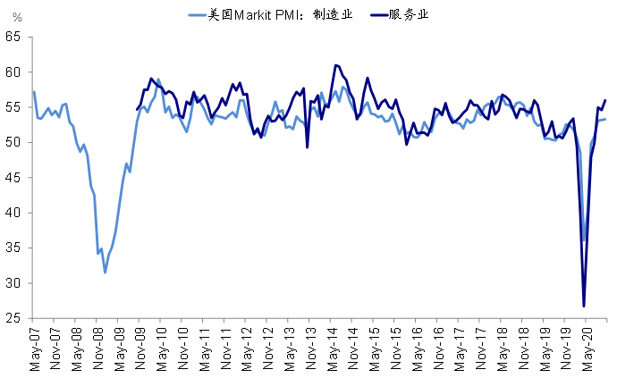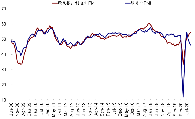 vi.基本面角度,疫情升级可能会对欧洲增长带来相对更大的拖累,进而拖累资产价格的相对表现和汇率。由于欧洲的政策刺激力度原本就没有美国大、而且采取的防控措施也较美国更为严厉,因此其阶段性的对部分需要和增长的拖累也将更为明显。例如,欧洲服务业PMI已经重回收缩区间,而美国制造业和服务业PMI都依然在扩张区间继续改善抬升。