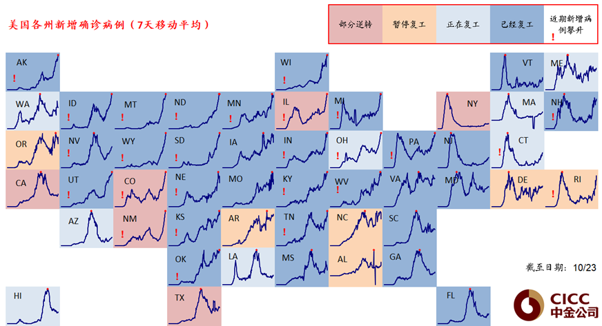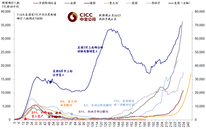 i.近期海外市场(特别是欧洲)再度大幅波动,主要还是与担心疫情的持续升级有关。目前,欧洲第二波和美国第三波的疫情仍在持续攀升,美国第三波疫情的每日新增确诊病例已经超过第二波的高点,上周五一度高达8.5万例;欧洲也在继续攀升,特别是法国尤为显著。