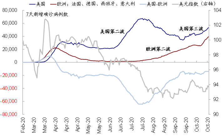 这一分化,可能会阶段性的对欧洲资产(如股市和欧元汇率)产生拖累。以美元指数为例,其从7月以来的走势,基本就与欧美之前的疫情差高度重合。这正是基于这一考虑,我们在海外资产配置10月报《大选冲刺期的配置策略》中判断,欧洲疫情的升级可能给复工进程和短期市场情绪造成压力,并被动推升美元指数,因此维持对于欧洲谨慎乐观的看法。