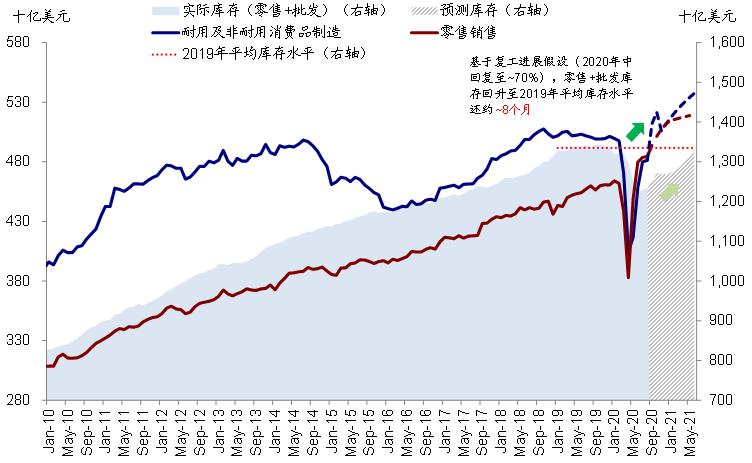 如果假设:1)当前第三波疫情对复工造成1个月的逆转再回升(当前~66%);2)消费逐步降速,一季度后降至~0.2%的环比长期增速,那么当前零售商和批发商库存回升至2019年平均值从目前还需要大概8个月左右,至2021年中。相对乐观和悲观的疫情与复工假设分别对应4个月和14个月,不考虑进口影响。
