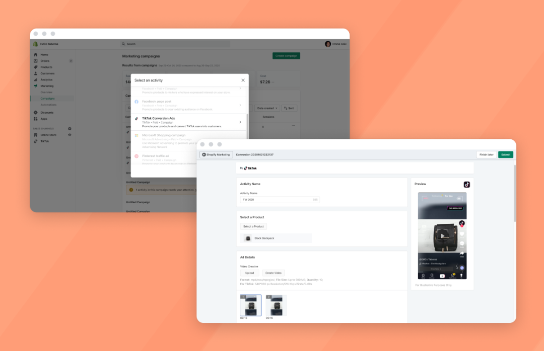 TikTok 渠道现已在美国推出,并将于2021年初在北美、欧洲和东南亚等其它指定市场陆续上线。欲了解有关 TikTok 的更多信息,请访问apps.shopify.com/tiktok。