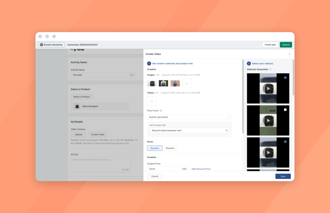 现如今,要想打造一个成功的品牌, Shopify 商家们需要无处不在,这也就意味着他们需要扩大自己的社交商务能力。TikTok 允许商家们在 Shopify 中创建和连接他们的 TikTok 企业帐号,并且直接显示可购物视频动态广告。商家只需选择自己想要重点推广的产品,即可自动生成视频广告,将用户引至 Shopify 商店进行结帐。这些现成模板专为商务而设计,也就是说无论品牌规模大小,商家们都可以通过现有的图片或视频对 TikTok 商务渠道进行充分利用。