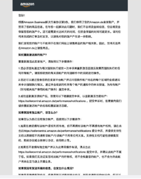 近日,一大批卖家都毫无征兆的收到了姐夫“透心凉”邮件,邮件表示:根据亚马逊商业解决方案协议第三条,我们停用了您的亚马逊账户,并禁用了您的商品信息……我们发现您的账户与不能用于在我们网站上销售商品的账户相关联(如下图)。