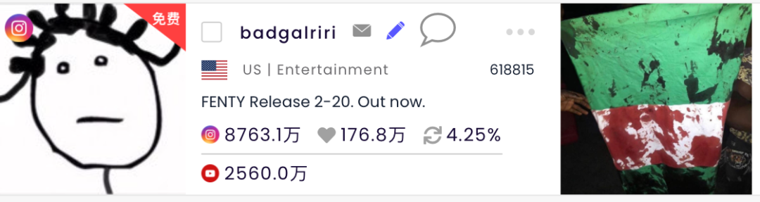数据来自www.socialbook.com.cn新生品牌借助网络更有助于用户覆盖面的扩展,加上蕾哈娜身份的特殊性,其社交媒体便成为了最低成本的宣传平台。