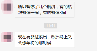 首先是物流方面,有卖家晒出与货代的聊天截图,该货代表示,此前欧洲封城时就暂停了不少航线,所以为防患于未然,建议现在卖家有货赶紧出。