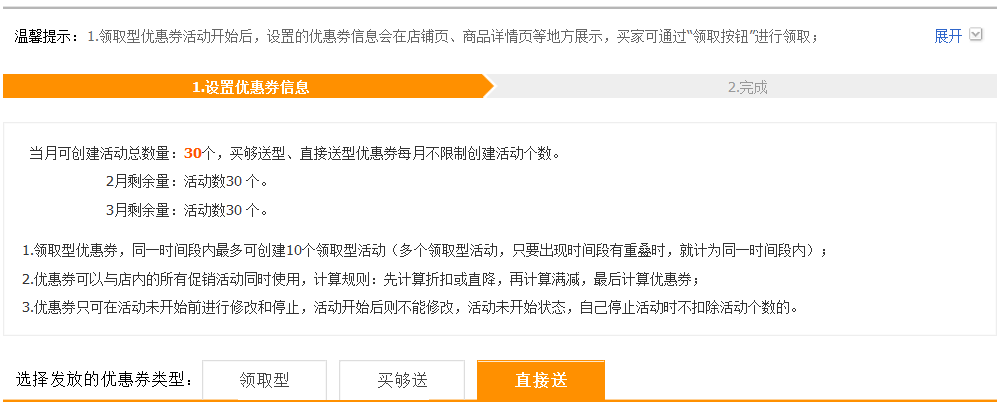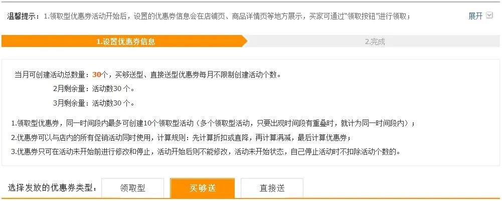 优惠券分为三种:"买够送"、"直接送"和“领取型”