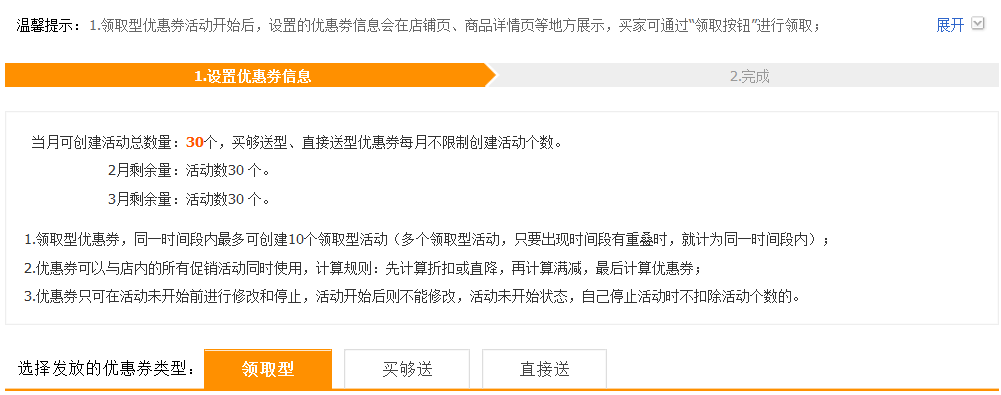 A 、优惠券的有效期是从买家获得优惠券的时间开始计算的,添加优惠券时最大可以设置180天的有效期。