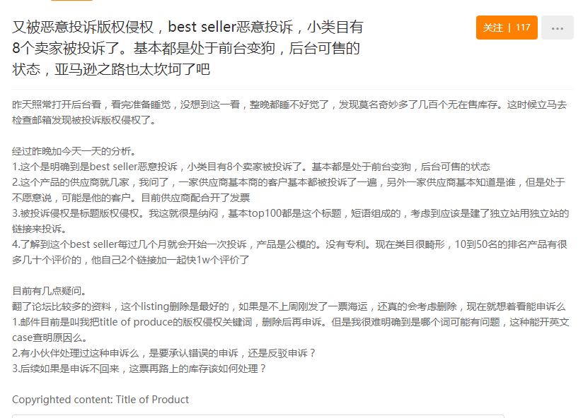 近日,有多个卖家控诉,前台几十个 listing 都惨遭版权(copyright )投诉 ——