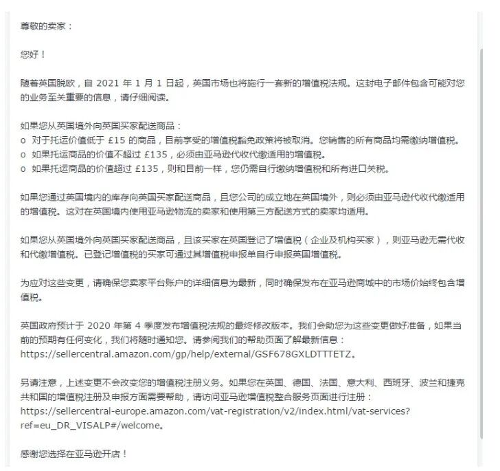 (点击可放大查看) 新规核心内容 1、如果卖家从英国境外向英国买家配送商品: 1)对于托运价值低于£15的商品,目前享受的增值税豁免政策将被取消。卖家销售的所有商品均需缴纳增值税。 2)如果托运商品的价值不超过£135,必须由亚马逊代收代缴适用的增值税。 3)如果托运商品的价值超过£135,则和目前一样,卖家仍需自行缴纳增值税和所有进口关税。 2、如果卖家通过英国境内的库存向英国买家配送商品,且您公司的成立地在英国境外,则必须由亚马逊代收代缴适用的增值税。这对在英国境内使用亚马逊物流的卖家和使用第三方配送方式的卖家均适用。 ! 特别注意! 卖家从英国境外向英国买家配送商品,且该买家在英国登记了增值税(企业及机构买家),则亚马逊无需代收代缴增值税。已登记增值税的买家可通过其增值税申报单自行申报英国增值税。 总的来说:从 2021 年 1 月 1 日起,账号注册公司主体是英国境外公司,英国站VAT税费全部由亚马逊平台代收代缴。卖家 FBA 仓库不在英国,但往英国销售,同样适用该政策,除非托运商品价值超 £ 135 。 事实上,亚马逊曾在官方直播中就有说过英国 VAT 税法变更一事,但当时候并没有足够引起卖家们的注意。 此事一出来,卖家圈迅速炸开,对此很多卖家仍存在疑问,为了进一步了解新规,以下是社长整理的答疑内容: 新规答疑 Q:亚马逊代收代缴 VAT 时间? A:英国站是在 2021 年 1 月 1 日,欧洲其他站点会陆续使用该模式,并且是强制性的。 Q:如果确认平台缴税成功? A:可以查看账户余额。 Q:欧洲站卖家还需要新注册 VAT吗? A:欧洲站卖家仍然需要新注册 VAT 。 Q:新规生成后,卖家需要申报吗? A:需要,VAT 代收代缴和 VAT 申报是不同概念,代收代缴只是缴税环节。亚马逊代收代缴税费后,卖家可以 0 申报,以避免重复缴费。 Q:亚马逊平台为什么不连申报也一块做了? A:如果是这样,亚马逊可能面临的问题是,自身数据要向税务局公开,但没有哪个平台愿意这样。 Q:卖家还能找税代做英国站的 VAT 申报吗? A:可以。 此事造成的影响 1、一定程度减轻卖家沟通负担,卖家不用和税代说明做多少申报的事情。 2、冲击税务代理,甚至会直接抢占了该相关服务商的饭碗。因为目前 VAT 机构是中间商,工作内容就是代缴,亚马逊宣布自己来干或者由亚马逊指定的服务机构,那样他们会拿下很多市场,就等于说,税务服务的这些服务商市场要没了。 3、从某种意义上来说,规范卖家申报的行为,遏制了先前的不报、漏报、谎报行为,给平台带来了一个公平竞争的环境。 4、英国站 20% 的税率会对低货值卖家带来不少冲击,欧洲站 9块 9 包邮将会一去不复返。 5、平台虽然帮助卖家代为缴费,但是申报事情仍由卖家操作,用第三方或者税代进行申报。 6、因为亚马逊会直接按照 20% 税率扣税上交税局,信息变得透明化,卖家需要考虑价格里是否包括含税价格。 7、调整了 申报和缴税的顺序,以往卖家是先申报后缴税,新规实施之后,是平台代扣,先缴税后申报。