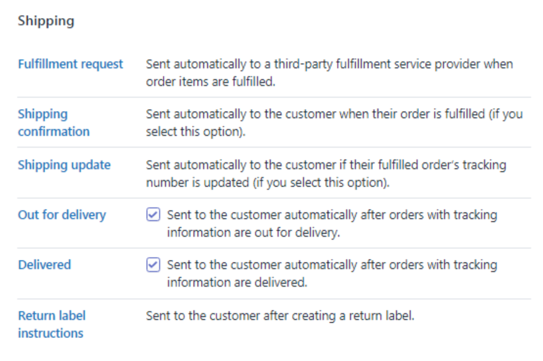 Shipping-物流通知:包括发货确认、物流更新、运输状态等等,可以选择勾选是否在物流派出时候、物流更新、已收货的时候给客户发email,一般默认勾选