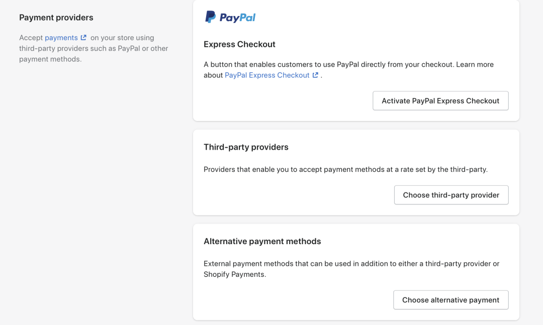 第一个就是PayPal,第二个就是相当于三方收款,跟PayPal其实差不多,就是其他的收款方式,比如2chckout,stripe钱海这些,第三个其他可供选择的收款方式,例如Alipay Global国际支付宝,这个一般用不到