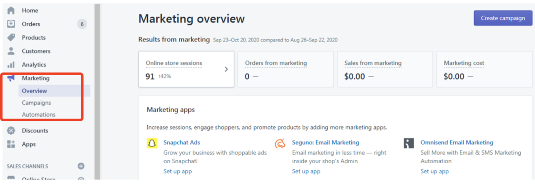 营销中心,在这里可以看到我们的EDM的召回效果,我们可以选择用shopify自带的邮件召回功能,但是模板较单一,可选择的召回时间也比较有限。