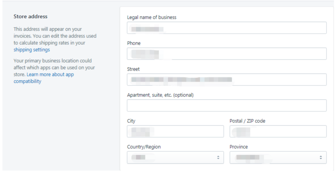 店铺地址:这里的店铺地址会出现在我们给客户的invoices里,需要注意的是,网站下方的about us并不是在这里设置的。