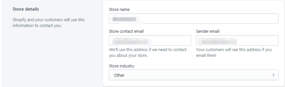 店铺名称可以在这里自己进行编辑,会显示在首页里面;账户邮箱和客户邮箱都可自行设置,账户邮箱一般用来练习Shopify官方,客户邮箱则一般用于联系客户的。