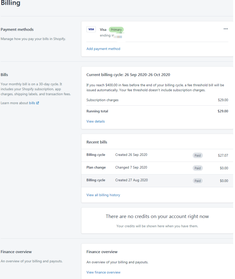 Bills-账单:这里会显示你的所有消费的账单,并且账单信息会以邮件的形式发到你的邮箱,账单包括你在Shopify的任何费用 - 月租、app费用、手续费等等。