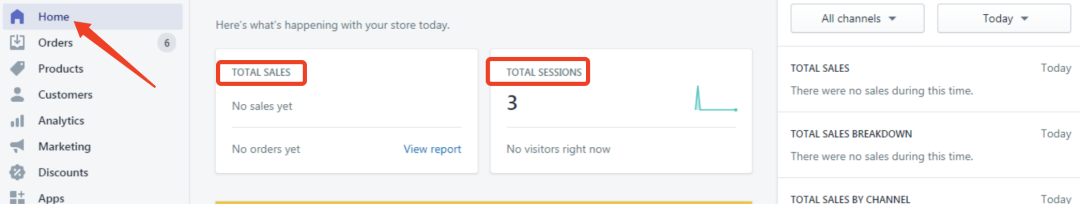 这里是Shopify的主界面,这里主要是反馈整个店铺的运营情况,展示整个网站的销售额、网站浏览量、热销产品等等