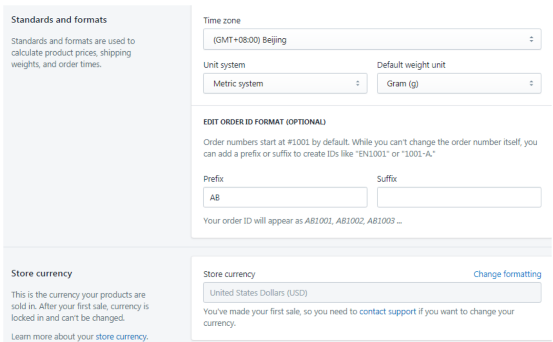 时区和货币:时区可以自行选择,一般Shopify后台的时区最好和广告账户的时区统一,便于统计数据(比如你的目标地区是美国,那就可以将账户时区和店铺时区都设置为太平洋时间),下面指的是订单的格式,一般默认就可以了,当然也可以设置成你喜欢的样子,比如默认的就是#1001,#1002。货币一般就选择USD就可以了,当然如果你的目标地区是某个特定的国家,也可以设置其他的货币格式。