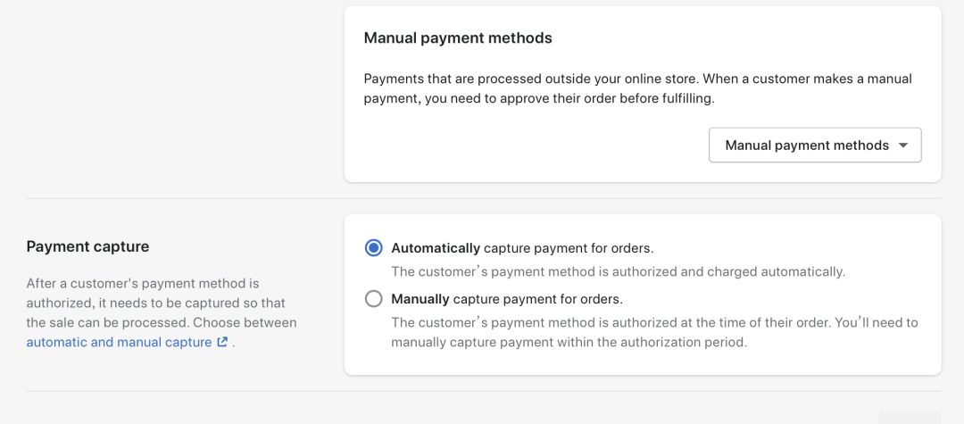 第四个Manual payments methods:除了以上,Shopify还支持银行转账,现金支付,以及货到付款等收款方式,可以在这里选择使用