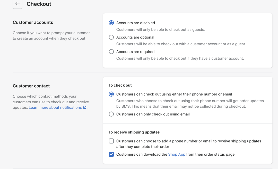 主要介绍用户在结账的时候的流程,这一块的设置会影响到用户下单的流程以及我们对客户信息的收集。