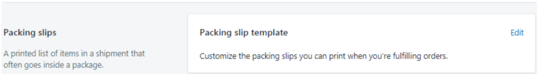 Packing slips-装箱清单设置:Shopify会提供一份装箱清单模板,需要的话可以打印出来随货物一起发给客户,需要修改的话也可以点击Edit编辑。