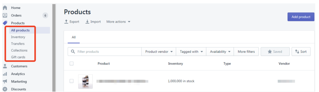 产品页面,可以看到网站的产品信息,包括产品的上传、删除修改等等。另外库存、产品分类、礼品卡等也是在这里进行设置