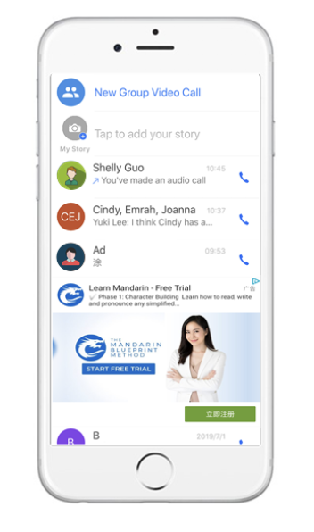 首页聊天页,广告展示在最近24小时内和超过24小时的对话中间展示。
