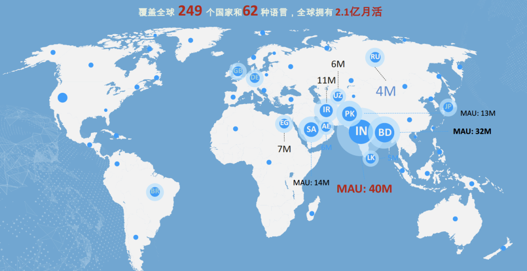 截止到2019年底,BIGO三款产品相加在全球150多个国家和地区有近4亿月活用户(MAU), 同年TikTok的MAU是5亿。2020年的最新数据中,Bigo旗下的imo视频通讯社交月活高达2.1亿。