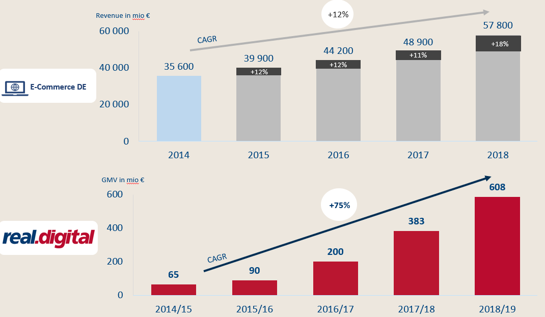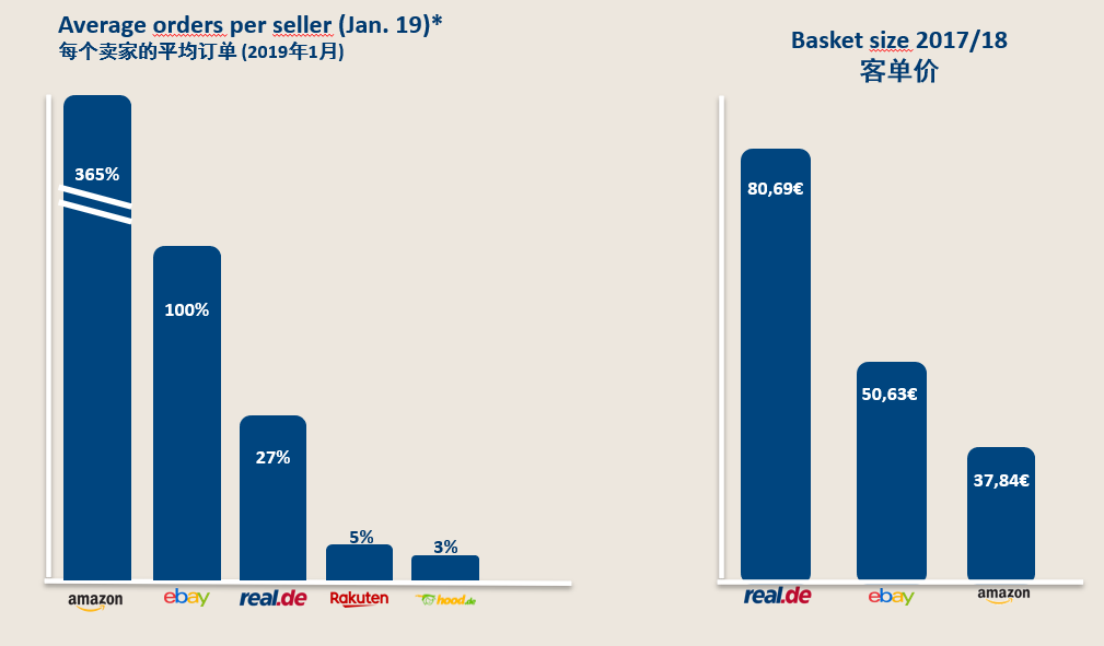 2019年8月,因美国市场竞争压力变大,某消费电子商品卖家转向欧洲市场并入驻德国real.de平台。截至去年12月,其店铺月流水就达到了25万欧元,远超预期。 除此之外,通过入驻real.de平台在短期内大获成功的卖家还有很多,那么real.de平台究竟是什么?又为何能在短期内帮助众多卖家实现销售额的快速增长? real.de:实力与潜力兼具 Real.de作为德国第三大电商平台,拥有1900万每月客访量,1500万个SKU,5000个类别,拥有5000注册商家,近80万脸书粉丝,280个线下门店超市,每周订单超过2300万单。 作为新进入中国市场的欧洲电商平台,real.de强势C位出道,迅速抢占市场,成为最有潜力的跨境电商新蓝海平台之一,而这些都得益于平台的多方面优势。 1. 平台年增长率高达75% Real.de作为德国增速最快的电商平台,近5年来,德国电子商务市场年增长率为11%,而real.de则达到75%。 加之今年6月,欧洲最大的零售集团SchwarzGruppe正式收购Real.de,依托其资金和资源优势,real.de还将迎来全球领域的进一步扩张。 2. 销售额增长潜力巨大 从下图2019年数据来看,real.de平台平均客单价为80.69欧元,远超同期亚马逊的37.84欧元和ebay的50.63欧元,居三大平台之首。而其销售订单量仅占27%,拥有极大的销售增长空间。 有人形容其为2010年的亚马逊,竞争少、增长快、收入高。而你只要做的仅仅是上传产品。 3. 站内外多渠道引流曝光 在推广引流方面,real.de打通了Google和idealo的线上广告,可直接将购物者导向自己的网站,从而给平台带来了极大的流量。 此外,Real.de也会每周每月举行促销活动,邀请业内具有影响力的KOL或网红推广平台上的产品,而卖家自身也可以在线上利用CPM广告进行推广,有效保障了卖家店铺商品的高曝光度。 4. 多品类销量增长率超100% 2020年截止第三季度,Real.de的销量一路逆袭,热门品类销量平均增长率超过100%,其中电子产品、运动器材等产品,增长甚至超过1000%! 其他品类产品也有了显著的增长,今年7月,家用产品的销量同比增长了100%。桌子,椅子,卧室用品,灯具都是最受欢迎的明星产品。剃须刀类产品,销售额也同比增长了200%。而此增长趋势在接下来的旺季中还将继续保持。
