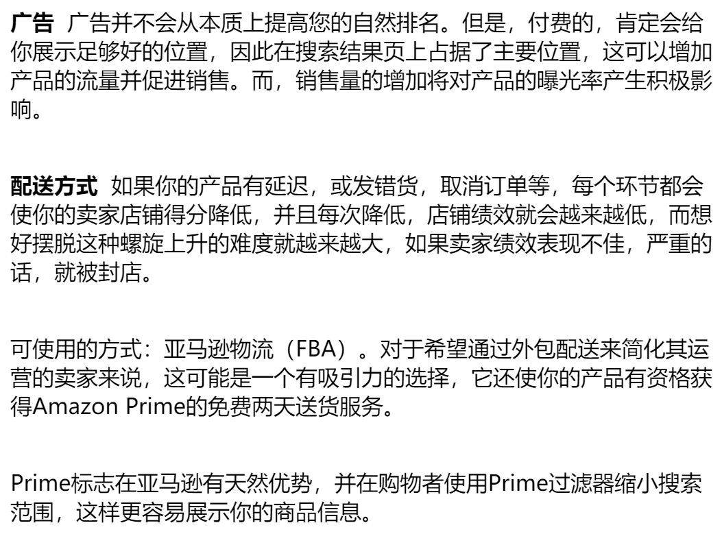 虽然你可以直接控制商品描述,价格和库存,但在亚马逊上取得优势,最重要是取决于你的转换速度,即,销售速度。上面提到的图像和增强的内容格式,以及下面将会讲到的广告,配送方式,评分和评论,都可以提高你的销售速度,最终让你的产品获得更多的曝光。