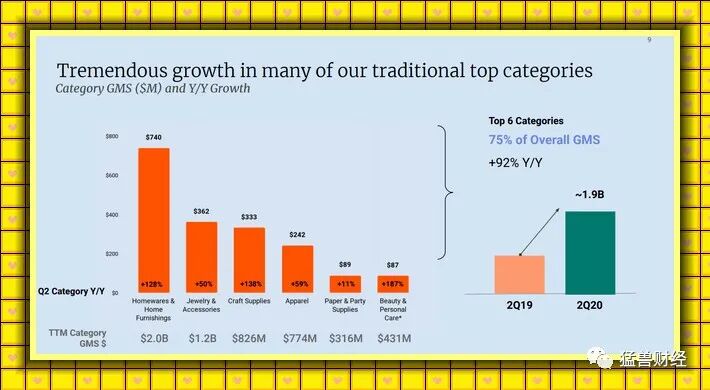 投资者对Etsy持谨慎态度的一个主要原因是:今年口罩在Etsy平台上的火爆销售,只是一个暂时的推动因素。当口罩不再稀缺时,股价自然会跌。然而,这种观点可能是见树不见林,实际上Etsy平台上不但口罩销售的特别好,其他所有品类都做得很好,许多最初被Etsy吸引来寻找口罩的买家和卖家将在未来为Etsy平台带来源源不断的业务。