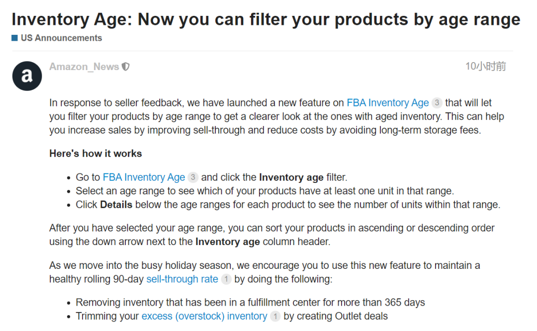 好在亚马逊似乎也察觉到了卖家们目前的困境,宣布推出关于“FBA库存年龄”的新功能。