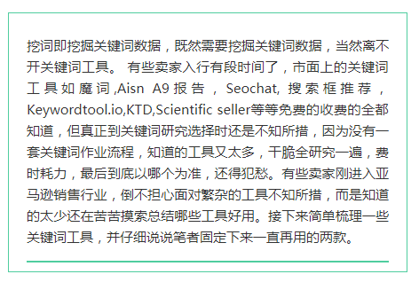 除了以上工具可以用于挖掘关键词,还有amz scout,紫鸟,船长等等吧,实在太多了,找到一款合适自己的才最重要。笔者常用的关键词工具是a9报告和魔词,两者结合实属完美。