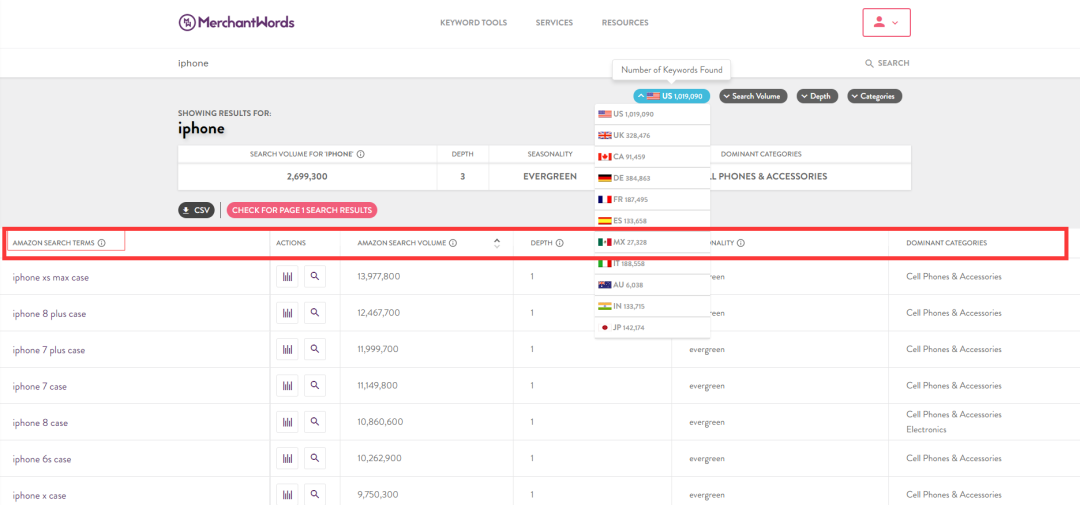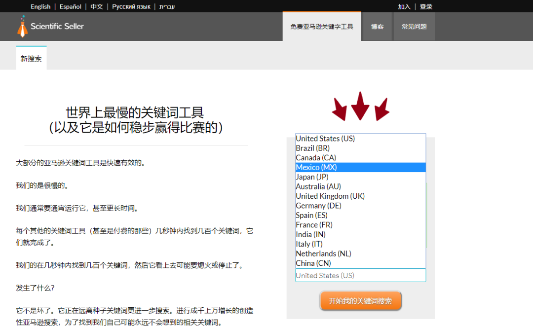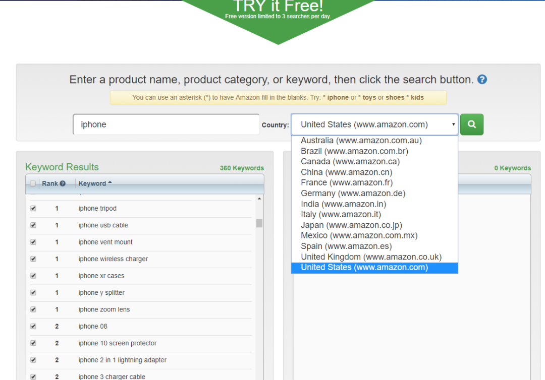 优点:填入词这部分是不错的设计,一方面可根据填入词的频率选择出好的词放入search term,另一方面根据填入词的频率也能初步判定市场主流的产品。可以挖掘出很多长尾关键词,同时支持14个站点的关键词查询。缺点:只能挖掘出“词根+"的关键词,无法挖掘“+词根”或“+词根+”的关键词。挖掘出的关键词没有搜索量参考,很难判断哪些关键词比较热搜。